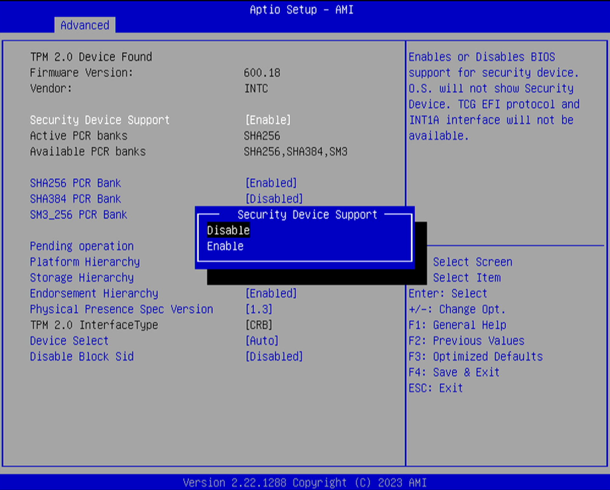 3.将【Security Device Support】 设置为Disabled,也就是禁用