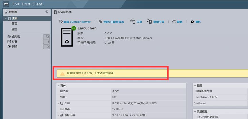安装完Esxi登陆后总是提示:检测到 TPM 2.0 设备,但无法建立连接。