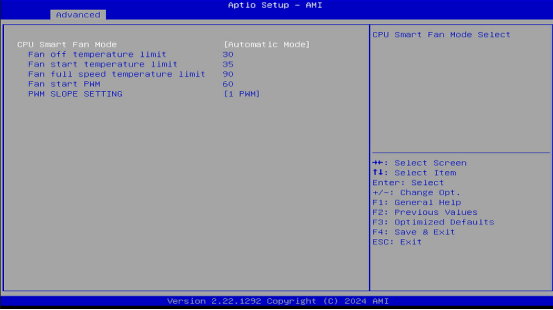 4.CPU Smart Fan Mode】为CPU风扇设置【Automatic Mode】该模式为自定义模式可以对温度以及转速进行自定义设置,如果您需要设置更多参数可以使用该模式