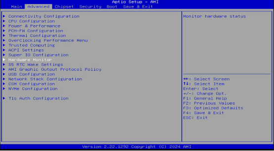 2.进入BIOS后,使用方向键切换到【Advanced】选项,进入【Hardware Monitor】菜单